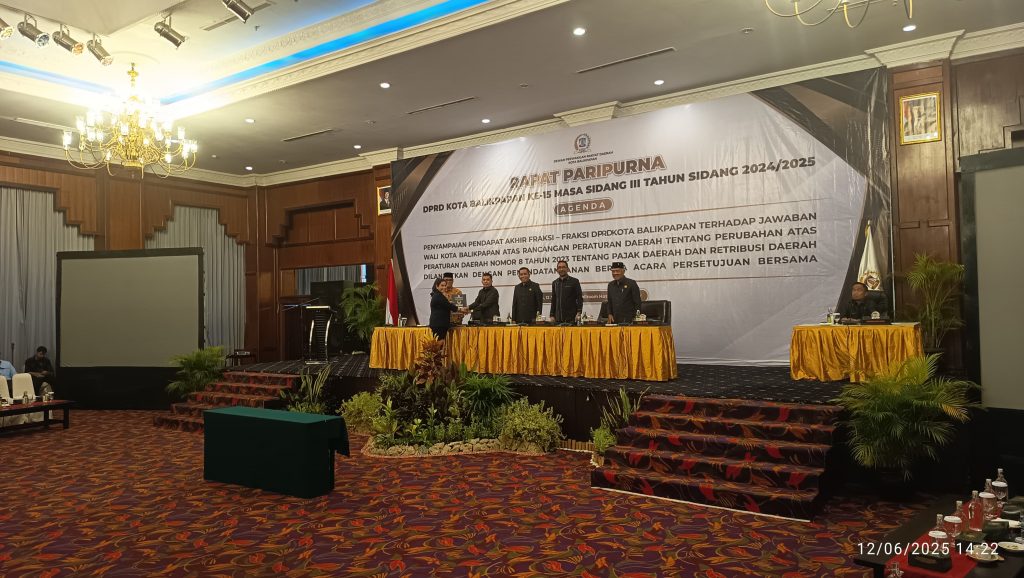 Portalsembilan, BALIKPAPAN – DPRD Kota Balikpapan menggelar rapat paripurna dengan agenda penyampaian pendapat akhir fraksi-fraksi terhadap Rancangan Peraturan Daerah (Raperda) tentang Perubahan atas Peraturan Daerah Nomor 8 Tahun 2023 mengenai Pajak Daerah dan Retribusi Daerah. Rapat tersebut digelar pada Kamis (12/6/2025) dan ditutup dengan penandatanganan Berita Acara Persetujuan Bersama antara DPRD dan Pemerintah Kota Balikpapan.