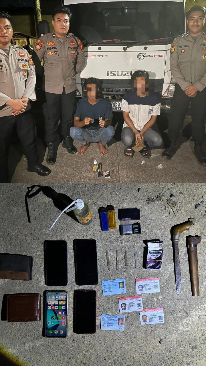 Adapun barang bukti yang berhasil diamankan meliputi 1 buah senjata tajam jenis badik,1 bungkus rokok berisi sabu seberat 0,33 gram,4 unit handphone,4 buah pipet,1 bong dan alat hisap,1 sendok takar,1 timbangan digital,2 korek api,dan 1 unit kendaraan truk R6 warna putih .