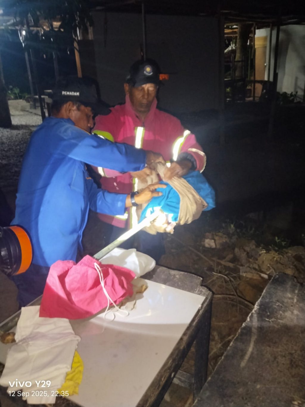 Laporan pertama diterima sekitar pukul 14.57 WITA dari seorang warga bernama Bapak Rumpa. Setelah melakukan koordinasi, tim Damkarmatan Pos Sektor Muara Badak bergerak ke lokasi pada malam hari untuk melakukan penanganan dengan pertimbangan keselamatan. Proses evakuasi berlangsung dari pukul 22.00 hingga 23.30 WITA.