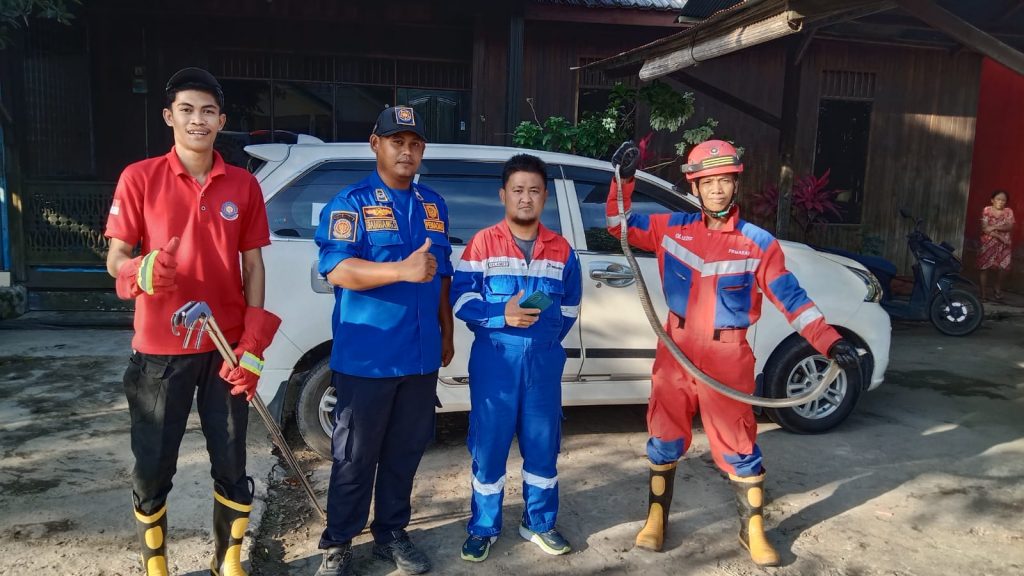 Dalam operasi penangkapan ular kobra ini, tim Damkarmatan Pos Sektor Sanga Sanga juga dibantu oleh anggota Redkar (Relawan Pemadam Kebakaran). (Adv/Diskominfo).