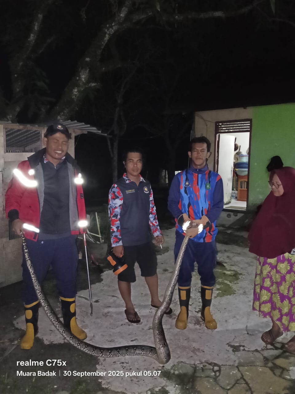 Portalsembilan.com, Kutai Kartanegara – Warga Jl. H. Mahmud RT. 20, Desa Muara Badak Ilir, Kecamatan Muara Badak, Kabupaten Kutai Kartanegara, dikejutkan dengan kemunculan seekor ular sanca (sawa) di lingkungan pemukiman mereka pada Selasa dini hari (30/09/2025). Mendapat laporan dari warga bernama Ny. Sitti, petugas Pemadam Kebakaran dan Penyelamatan (Damkarmatan) Pos Sektor Kecamatan Muara Badak bergerak cepat menuju lokasi kejadian.
